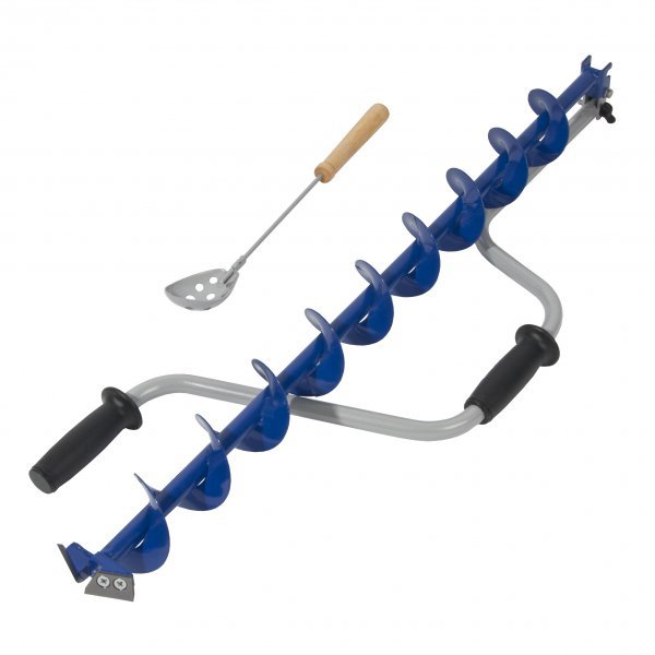 Ледобур комплектуется специальным черпаком с деревянной ручкой для лунок диаметром 80 мм, а также дополнительным комплектом запасных ножей.