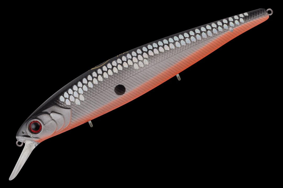 FLIRT 115SP имеет две, разделенные боковой линией, рельефные фактуры поверхности. Верхняя часть (спинка и бока) выполнена в виде ромбовидных насечек - чешуек, нижняя (вплоть до брюшка) в виде косых насечек. Головная часть воблера рельефно имитирует жаберные крышки. Объемные 3D глаза завершают реалистичный дизайн приманки. FLIRT 115SP имеет систему дальнего заброса и баланса , а так же встроенную шумовую камеру с мелкими шелестящими шариками. Приманка оснащена тремя тройниками VMC BN. Качество лако-красочного покрытия соответствует всем современным требованиям.