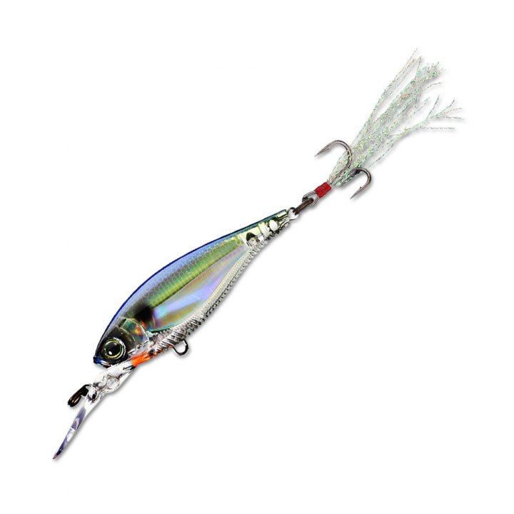 Модель воблера 3DB Shad от фирмы Yo-Zuri/Duel представляет собой кренк, который очень детально выполнен для максимального сходства с настоящей рыбкой. Все приманки от этой торговой марки изготавливаются на основе последних научных разработок и многолетнего опыта рыболовной практики. Представленный здесь шед не стал исключением. В дизайне этого воблера применяется особая призматическая окраска, которая заставляет поверхность реалистично переливаться, как чешуя настоящей рыбки. Рифление на брюшке обогащает низкочастотную игру Yo-Zuri/Duel. Довольно крупная лопасть обеспечивает «доставку» приманки в ее рабочий горизонт, который находится на глубине от 1,3 до 1,8 м. Чтобы этот кренк заиграл в воде, можно применить разные стили проводки: рывковую, равномерку или стоп-энд-гоу. Нейтральная степень плавучести отвечает за то, что во время паузы приманка просто зависнет на своей рабочей глубине. Для нерешительного пассивного хищника это послужит сигналом к атаке. Еще одним раздражителем для хищника станет опушка из нитей, которые создают дополнительную игру.